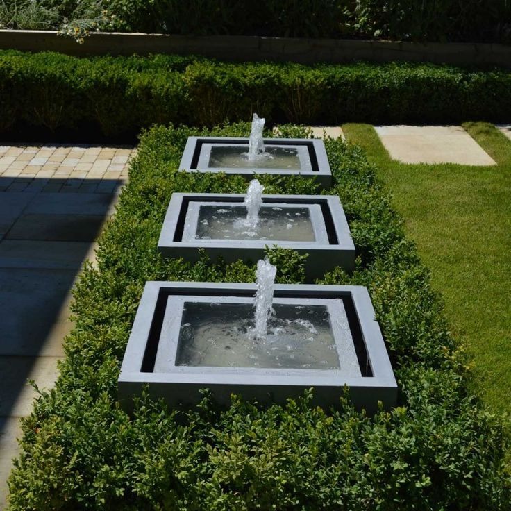 The striking installation shown here exemplifies sophisticated landscape design where fountains and surrounding elements work as unified composition rather than disparate features. These three identical square fountains—perfectly aligned, framed by boxwood hedges, and integrated with manicured lawn—demonstrate how water features achieve their greatest impact when conceived as integral elements of comprehensive landscape architecture.
