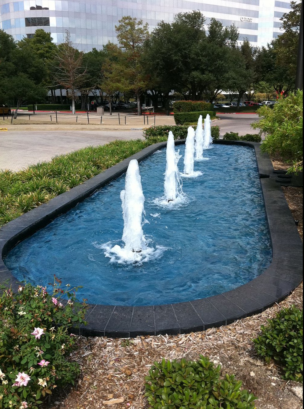 Corporate landscapes demand features that maintain pristine appearance with reasonable maintenance inputs. This fountain's design demonstrates practical considerations: smooth basin surfaces simplify cleaning, the dark liner conceals minor debris between maintenance visits, contained scale prevents the feature from becoming maintenance burden, and simple jet patterns require minimal adjustment and servicing.