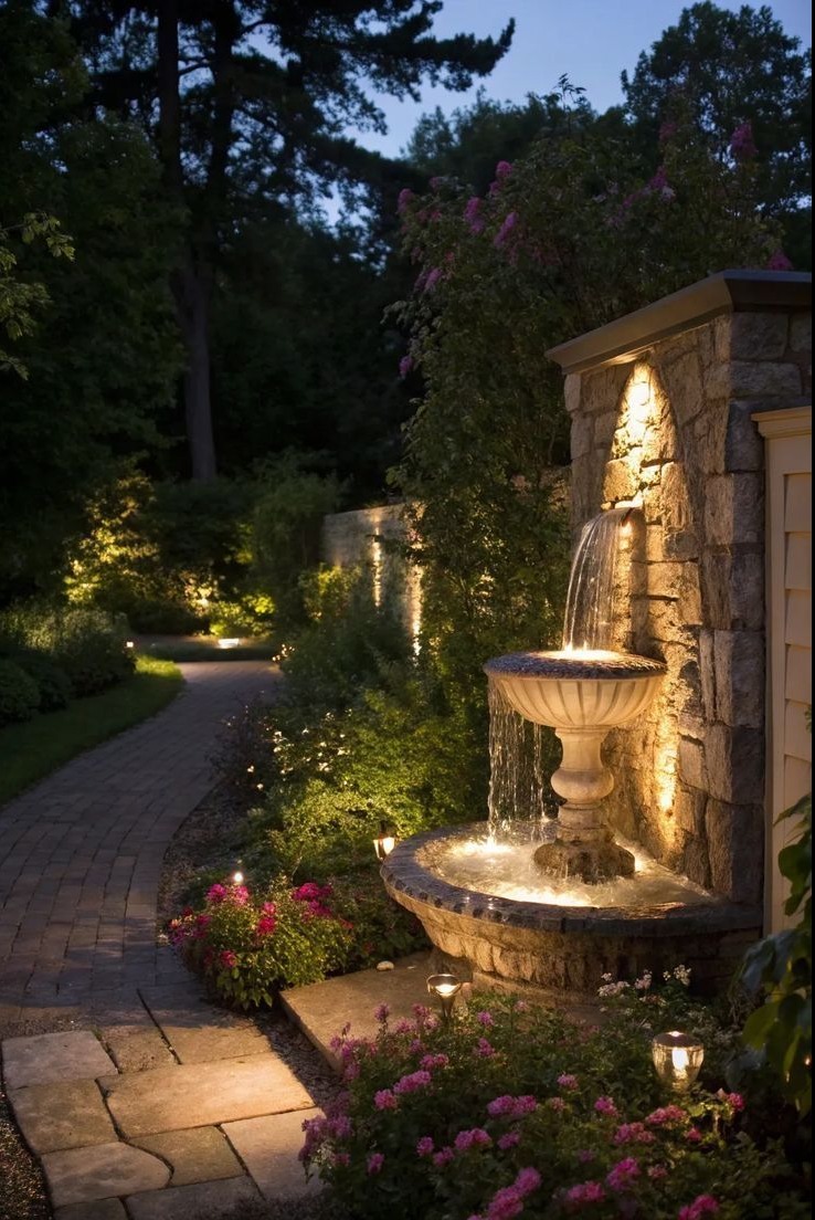 Accent Uplighting: The warm wash illuminating the stone wall behind the fountain creates dramatic backdrop that makes the water features stand out brilliantly. This backlighting defines the fountain's silhouette while the textured stone surface catches light beautifully, revealing dimensional depth.
