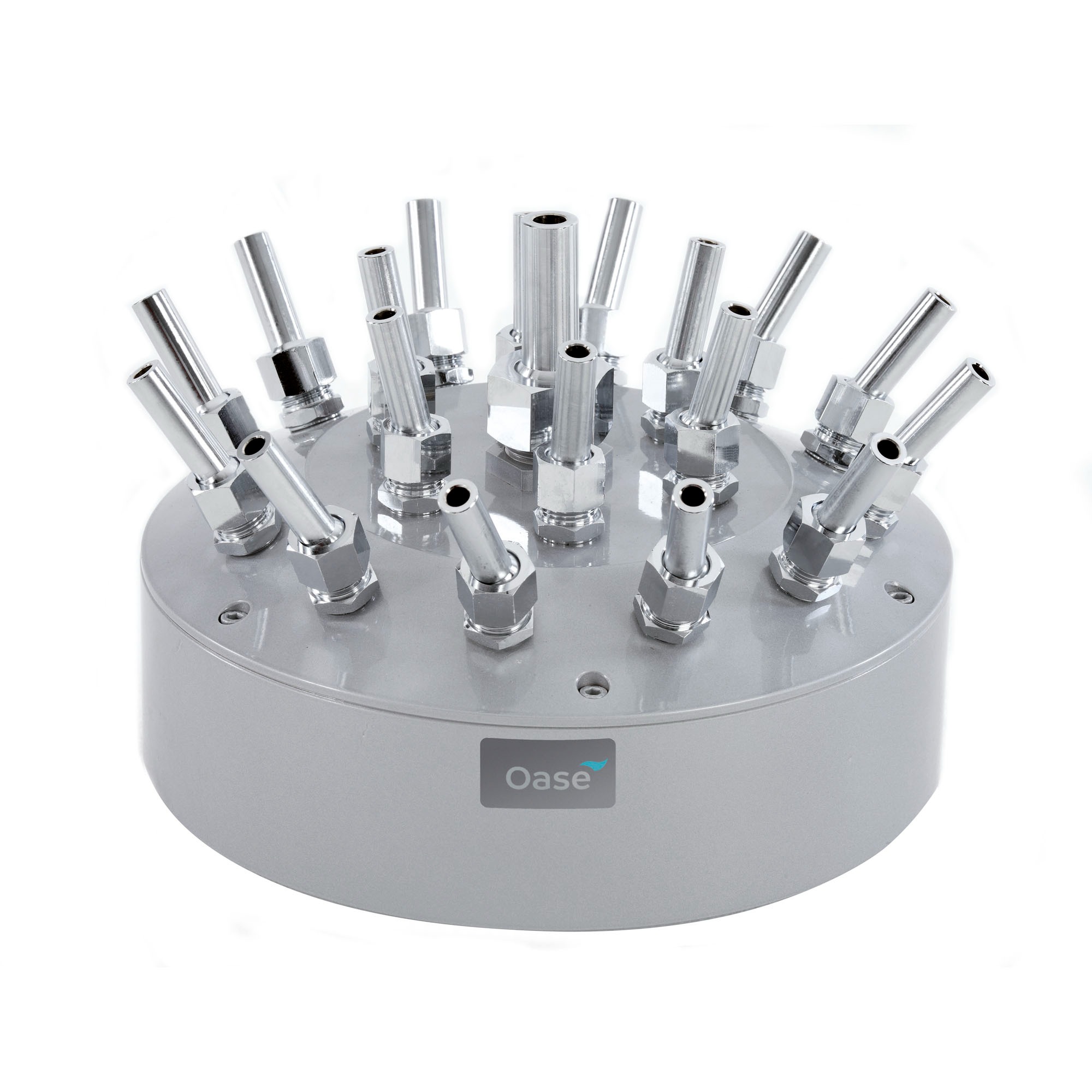 The polished stainless steel and chrome construction visible in the image reflects Oase's commitment to quality. Each jet tube is precision-machined and individually adjustable, allowing customization of every stream's angle and contribution to the overall pattern. This level of control enables fountain designers to create unique signatures tailored to specific installations.
