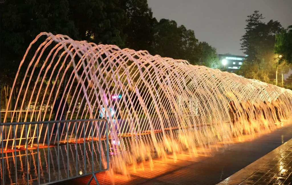 The evening spectacle shown here—with its dramatic arching water tunnels illuminated in cascading colors—demonstrates how precision nozzle engineering enables such spectacular effects. Hundreds of individually controlled jets create the lattice-work tunnel through which visitors walk, each nozzle delivering exactly calibrated flow at precise angles. This installation proves that enduring, reliable fountain performance begins with quality components engineered for longevity.