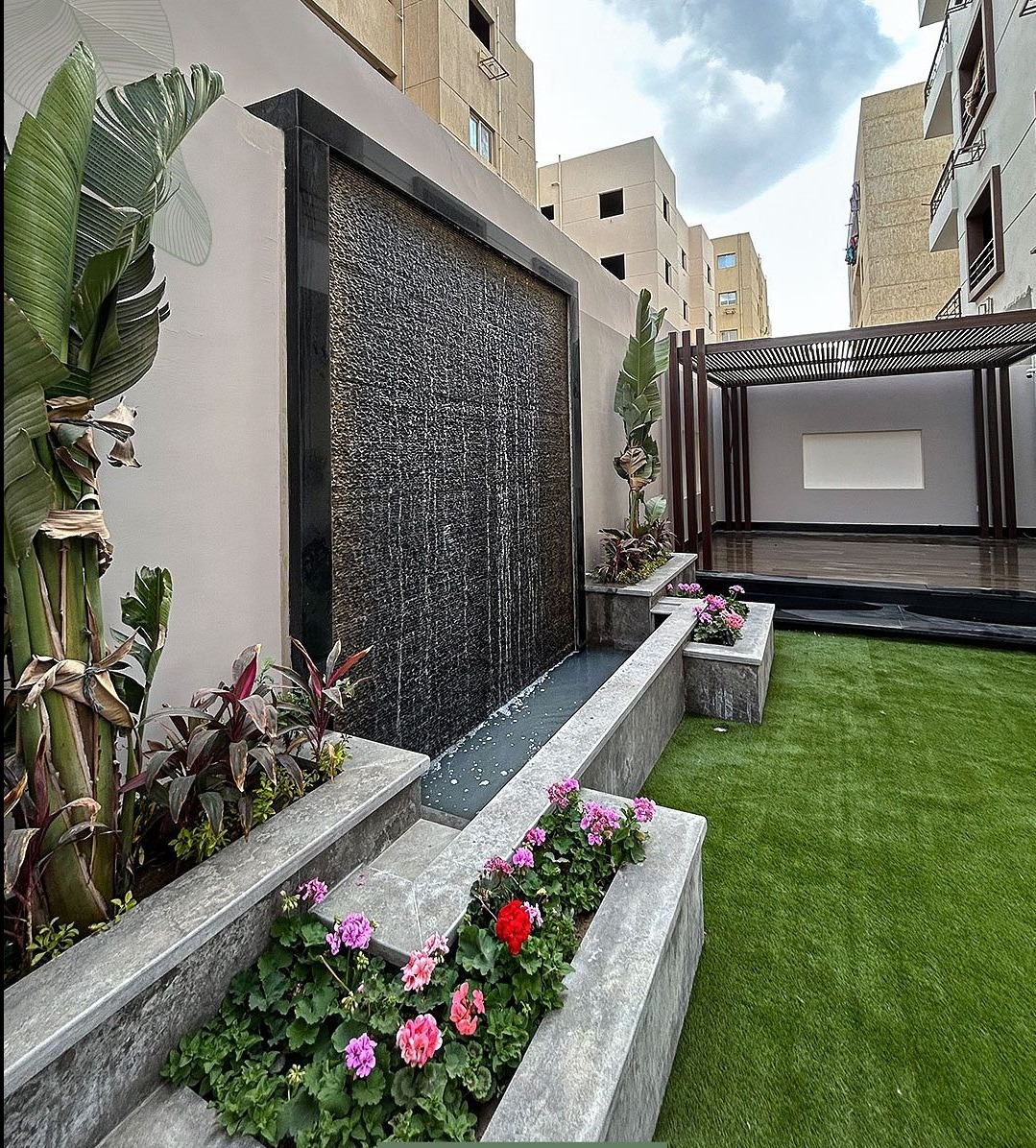 This installation demonstrates how urban outdoor spaces can rival luxury resort environments through thoughtful water feature integration. The combination of dramatic water wall, lush tropical planting, and contemporary architecture creates memorable outdoor experience—proof that square footage matters less than design intelligence.