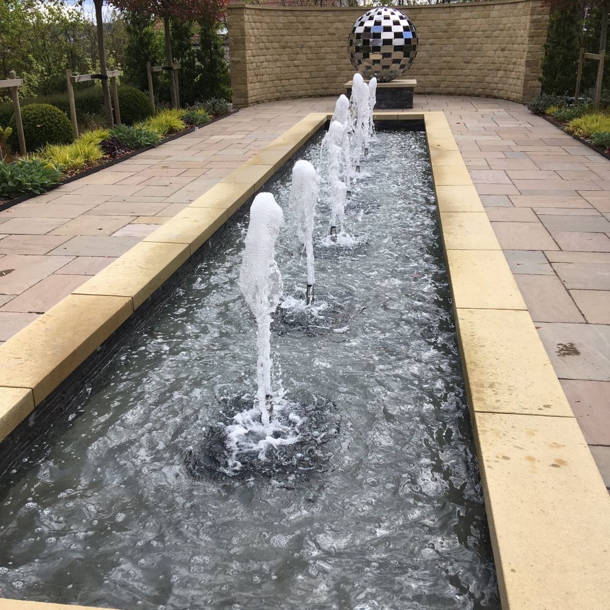 The checkered sphere positioned at the fountain's end serves as both focal point and visual destination. Its bold geometric pattern and substantial scale provide counterweight to the horizontal basin, creating balanced composition where water and sculpture dialogue rather than compete. The sphere's reflective tiles catch light and water spray, animating the static form through environmental interaction.